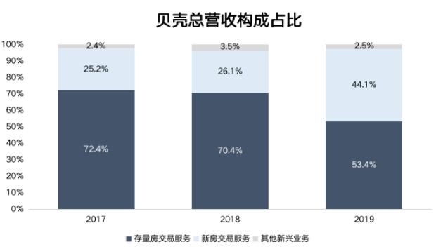 根据招股书的披露,贝壳有存量房交易、新房交易、新业务及其他三大业务板块。从年度数据来看,存量房交易收入一直是贝壳的第一大收入来源,2017年至2019年的总营收占比分别为72.4%、70.4%、53.4%。