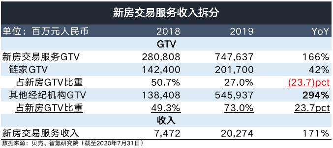 2019年,贝壳新房交易GTV同比增长166.2%至7476亿元,其中,链家品牌贡献的GTV是2017亿元,涨幅为41.6%。换句话说,贝壳平台上非链家品牌贡献了大多数的GTV,从2018年1384亿元增至2019年的5459亿元,涨幅达到294%。与之相对的是,2019年,平台新房交易经纪门店数量跃升至3.8万家,新房交易数量增多至53.3万笔。