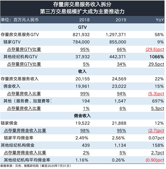 其中,佣金收入是存量房交易服务收入中最主要的来源,2018年和2019年,佣金收入分别占存量房收入的99%和94%。而包括服务费、加盟费在内的其他平台性收入增长迅速,2018年至2019年,同比增速达到697%。