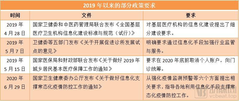 当然,除了医疗机构升级转型的内在需求,信息化建设同时也是政府、卫健委、药监和医保等多个部门强化医疗监管与服务的政策要求。2019年5月7日,卫健委等五部门发布《关于开展促进诊所发展试点的意见》,明确要求通过信息化手段加强行业监管与服务;2020年6月29日,国家卫生健康委办公厅发布《关于做好信息化支撑常态化疫情防控工作的通知》,从强化疫情监测预警等六个方面提出相关要求,指导各地利用信息化手段支撑常态化疫情防控工作,这一要求势必会强化医疗机构在信息化方面的建设。