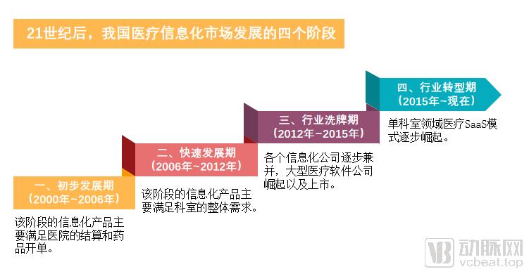 进入21世纪后,我国医疗信息化市场也开始快速发展。截止目前,共经历了四个时期。分别是第一阶段的2000年到2006年的初步发展期,该阶段的信息化产品主要满足医院的结算和药品开单;第二阶段是2006年到2012年的快速发展期,该阶段的信息化产品主要满足科室的整体需求;第三阶段是2012年到2015年的行业洗牌期,各个信息化公司逐步兼并,大型医疗软件公司崛起以及上市;第四阶段是2015年到目前的转型期,单科室领域医疗SaaS模式逐步崛起。