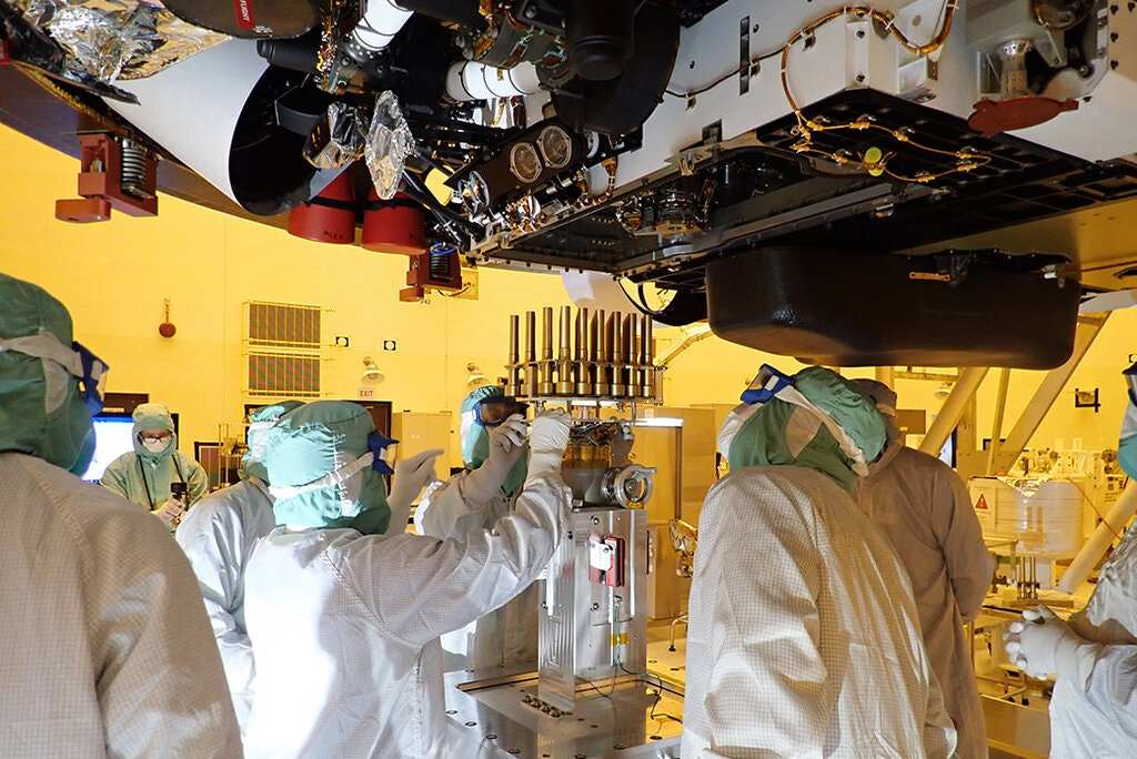 今年5月,肯尼迪航天中心(Kennedy Space Center)的工程师正在向“毅力号”漫游车底部安装39根样本管道。图片来源:NASA/JPL-Caltech/Agence France-Presse — Getty Images
