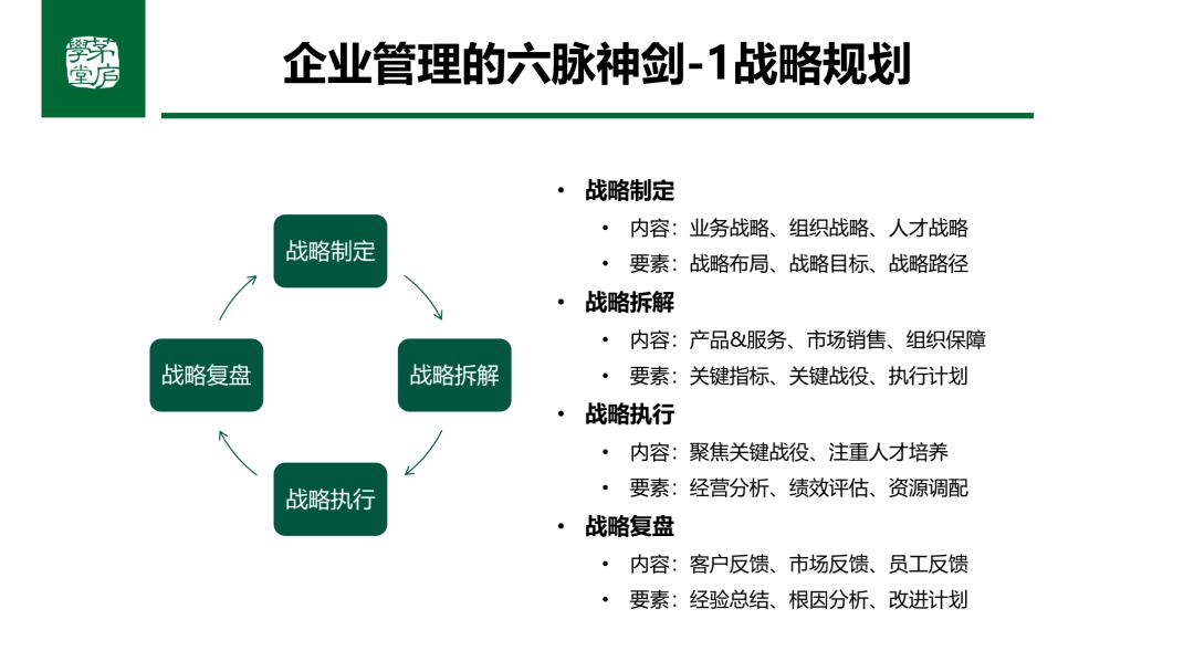 企业管理的六脉神剑,第一就是要做好战略规划,它的方法论只有简单的4步:战略制定、战略拆解、战略执行和战略复盘。