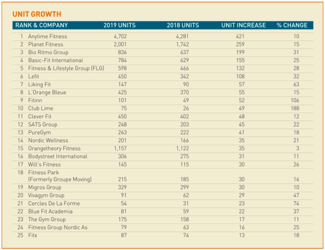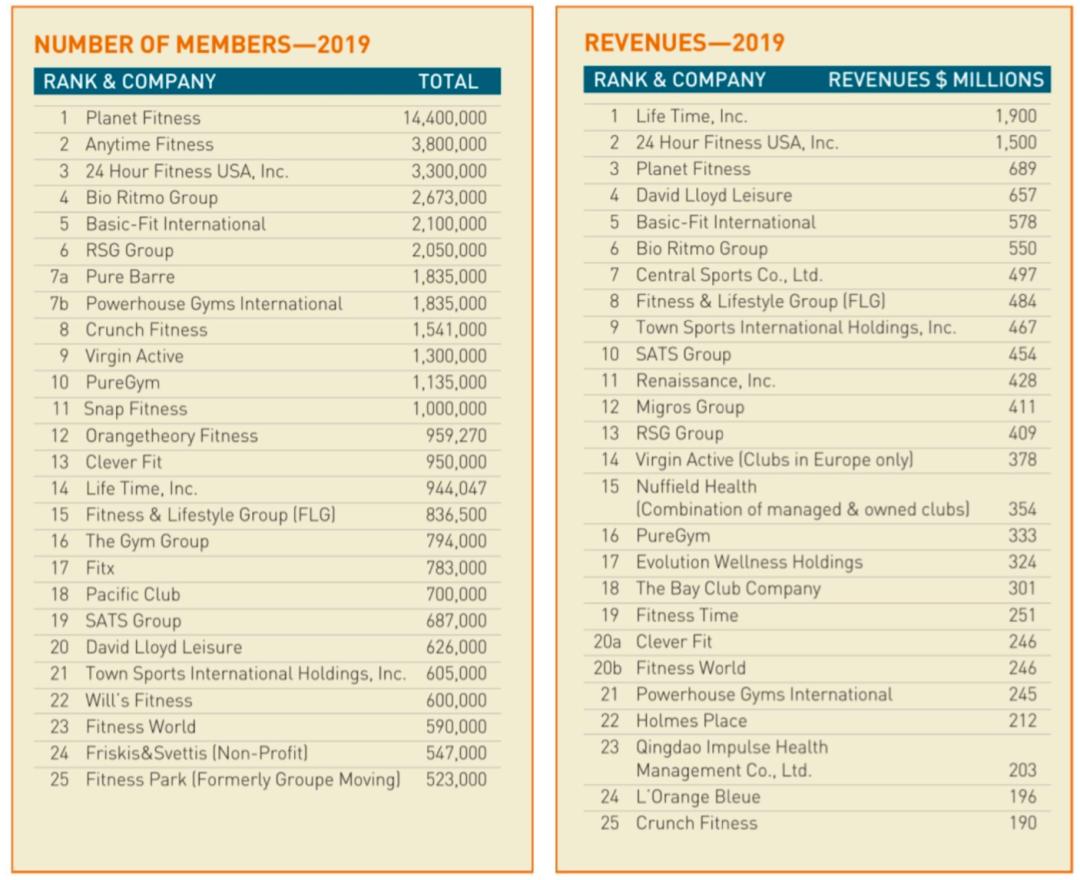 8月,美国IHRSA(国际健康运动与健身俱乐部联合会)发布了最新的全球健身房TOP25排行榜。本次榜单统计时间截止2019年底,纬度包含全球主要健身俱乐部的年收入、会员规模和直营/加盟门店总数等。
