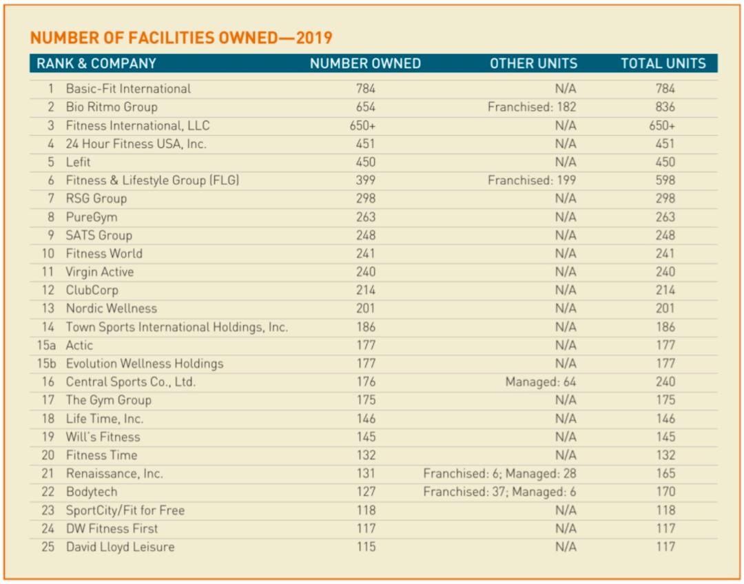主打平价健身的Basic-fit以784家门店数量,这家荷兰健身房在2019年位列第一。而紧随其后的则是巴西连锁健身俱乐部Bio Ritmo,如果算入其加盟店,其门店总数则会达到836家,完全处于全球先列。