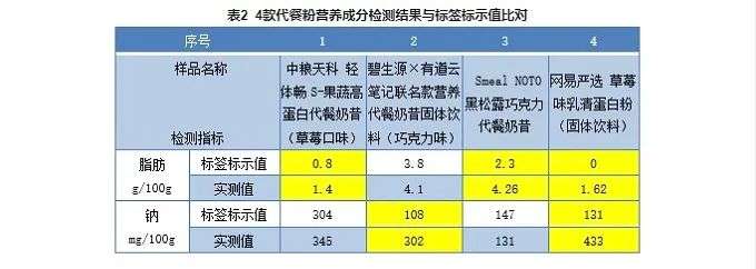 尽管多款产品的实测值与标签标示值不符,但仍在安全范围内。例如脂肪超标——网易严选奶昔的脂肪标示值为0,但实测值是1.62g/100g;再例如钠含量超标——碧生源奶昔的实测钠含量是标签的三倍。目前这两个产品已下架。