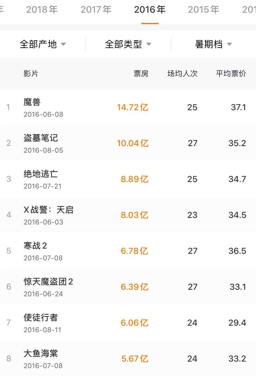 反观2016年暑期,整个档期内没有一部真正意义上的爆款诞生,档期内单片票房最高的《魔兽》只取得了14.7亿票房,档期票房占比11%。故这一年暑期的票房不升反降,同比减少了0.32%。
