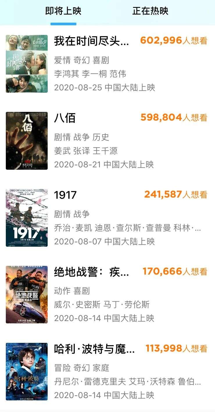 经过一年的期待,《八佰》终于宣布定档8月21日,成为电影院复工以来,首部确认上映的国产新大片。加上已经上映的《星际穿越》,即将上映的《1917》《哈利·波特与魔法石》等佳作,不少影迷都感慨,这个八月怕是要住在电影院里了。