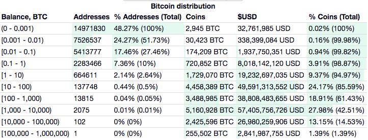 比特币地址中,48.27% 的地址占有全部币量的0.02%,相较上周微涨2%;24.27% 的地址占有全部币量的0.17%,相较上周下跌4.5%。