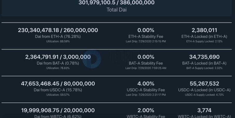 Dai Stats数据显示,7月29日MakerDao稳定币Dai总量突破3亿枚,达到3.01亿枚。其中76.28%的Dai通过抵押ETH生成,15.78%的Dai通过抵押USDC生成,6.62%的Dai通过抵押WBTC生成。目前,MakerDAO中锁定了超过238万枚以太坊和3774枚比特币(WBTC)。