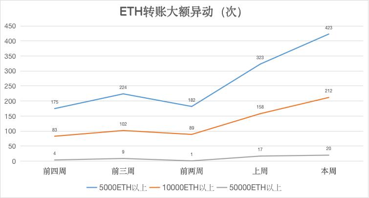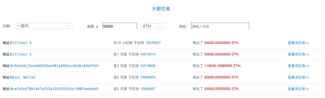 上周,“5 万 ETH 以上”转账次数共计 20 笔,最大转账金额 18.78 万个 ETH,系币安内部钱包地址互转,另外还有一笔总计 10 万 ETH的转账,同样系币安内部钱包地址互转;有 4 笔转账系 Bitfinex 钱包地址互转,总计 20 万个 ETH;有一笔 6.5 万 ETH 从 Nexo 钱包地址转出,该钱包还向另一地址转出 4.5 万 ETH;其余转账地址未知。