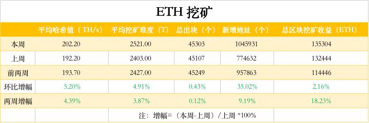 etherchain.org 数据显示,平均算力环比上涨 5.2%,暂报 202.2 TH/s;平均挖矿难度环比上涨 4.9%,暂报 2521 T;矿工活跃度上升,新增地址环比上涨 35%;由于交易活跃,网络拥堵,Gas 费用增加,挖矿总收入上涨 2.16% 。