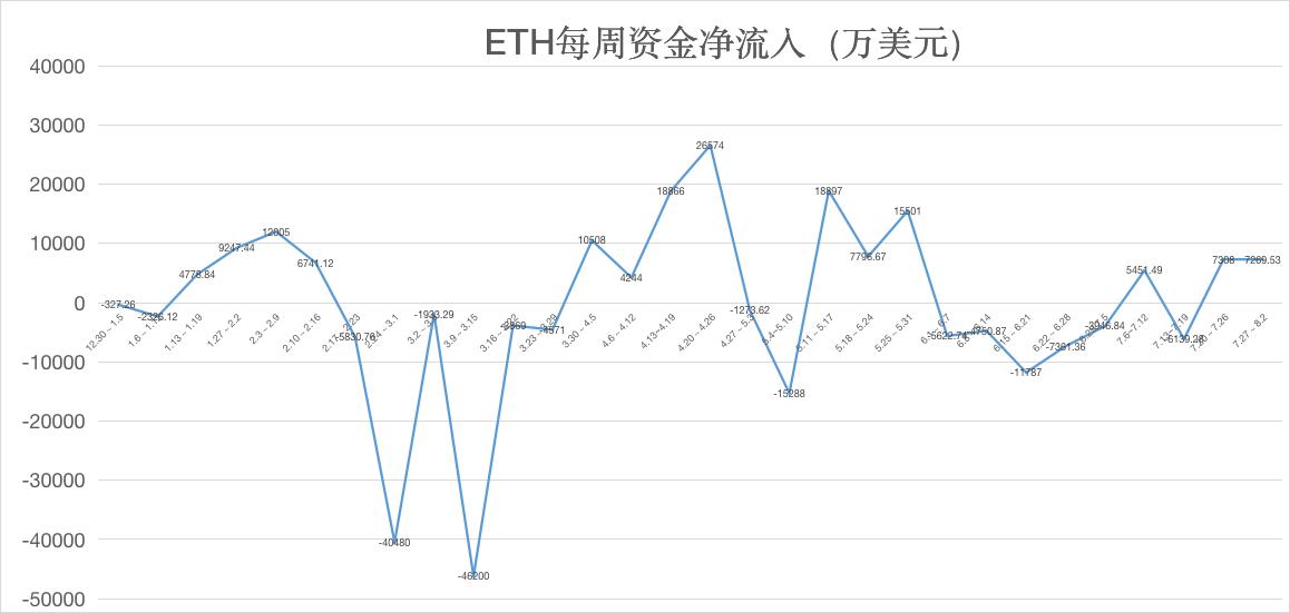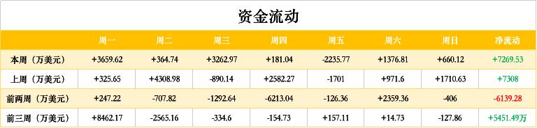 资金方面,上周资金波动较大,其中周一和周三净流入最大,超过 3000 万美元;周五净流出最大,超过 2000 万美元。