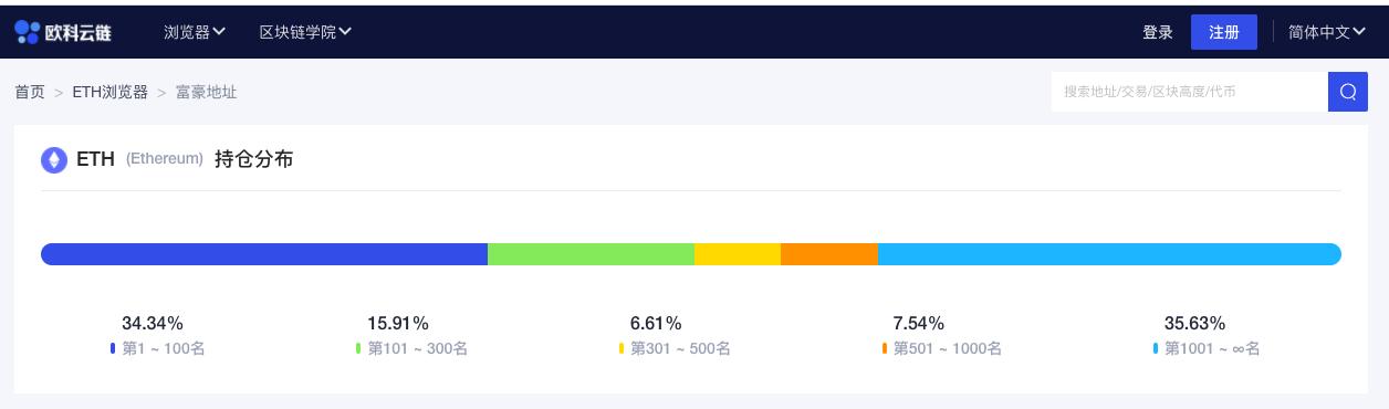 欧科云链OKlink数据显示,目前 ETH 持仓前 300 名,掌握了总计 50.25% 的 ETH,环比上涨 0.17%;整个持仓分布呈现椭圆形结构,各个部分占比分别是:第 1~100 名,占比 34.34% ,环比上涨 0.29%;第 101 ~ 300 名,占比 15.91% ,环比下降 0.12%;第 301 ~ 500 名,占比 6.61% ,环比下降 0.01%;第 501 ~ 1000 名,占比 7.54%,环比上涨 0.04%;第 1001 ~ ∞ 名,占比 35.63%,环比下降 0.2%。