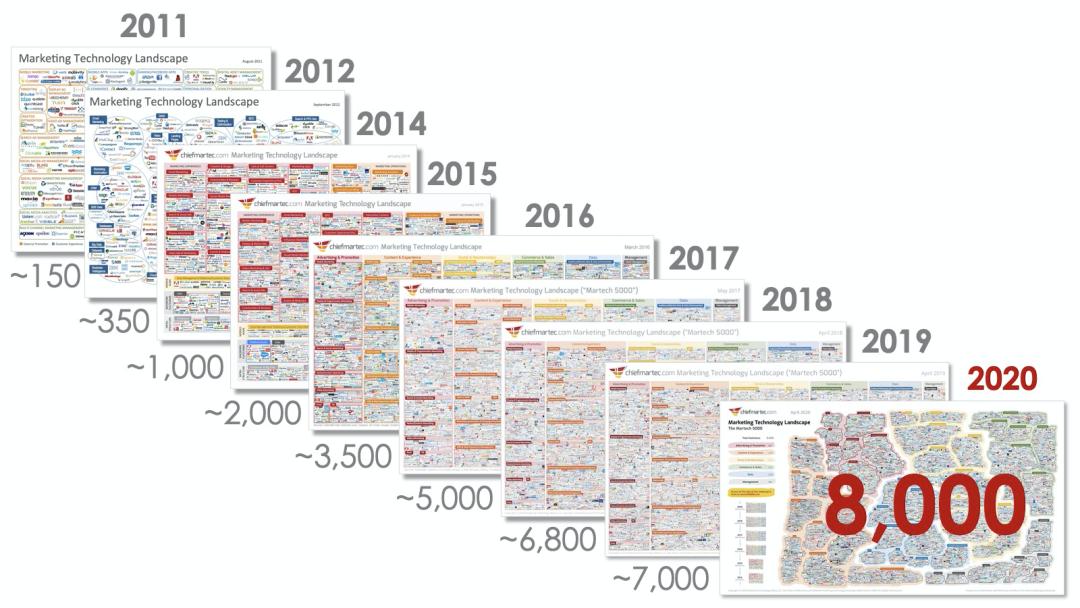 美国作为全球最领先的MarTech市场,他们的第一版MarTech营销图谱在2011年发布的时候,只收录了150家公司而已,而9年后的2020年发布的新版已经收录了8000家公司。