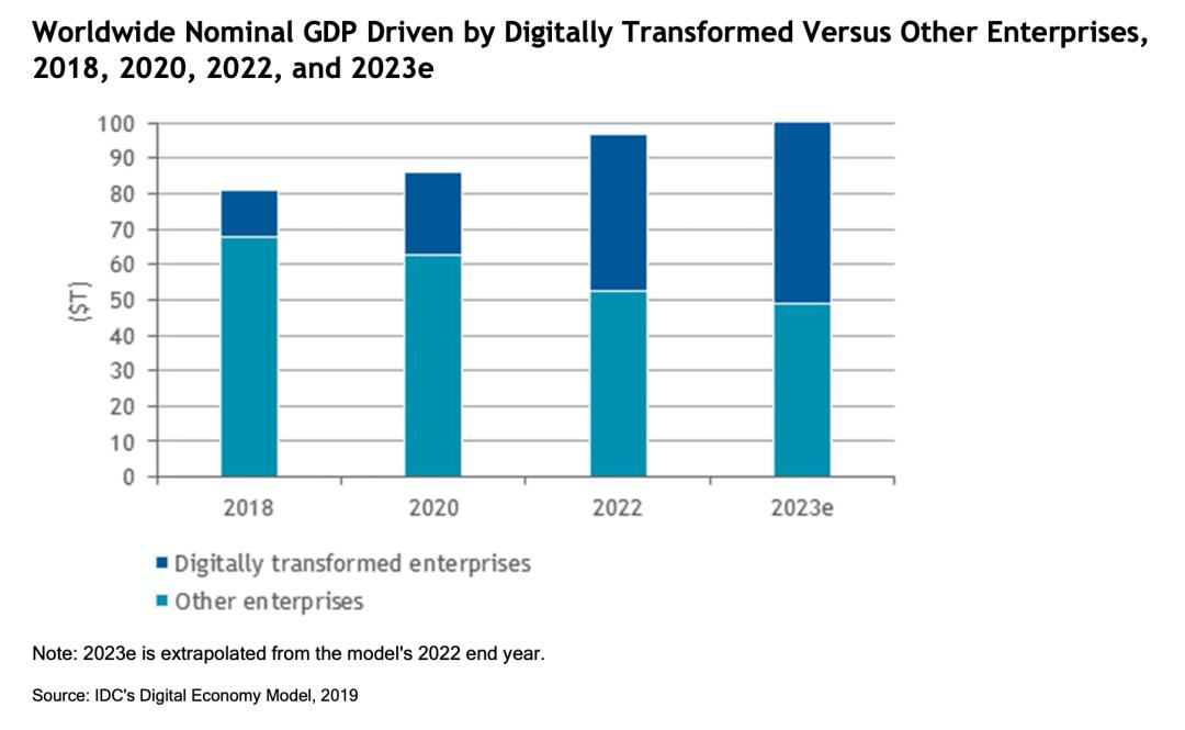 这张图想要表达的是,在过去的2018年,今年的2020年,以及接下来的2022年和2023年4个年度内,全球的货币GDP由数字化企业所推动的占比份额,相比那些没有引用数字化的企业。