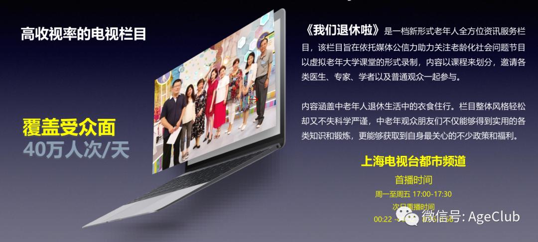 我们做了一个高收视的中老年电视节目,节目定位就是给中老年提供资讯,包括健康养生、兴趣爱好、时尚穿搭、旅游、吃喝玩乐。