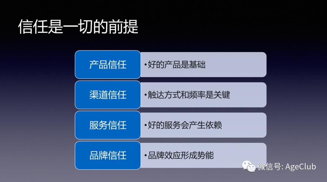 渠道信任对用户而言,就是“你要让我能够找到你”“你不会突然就跑了”。这就是为什么在央视打广告对中老年很有效,他们会觉得,你都在中央电视台都播了,这是权威,我相信。