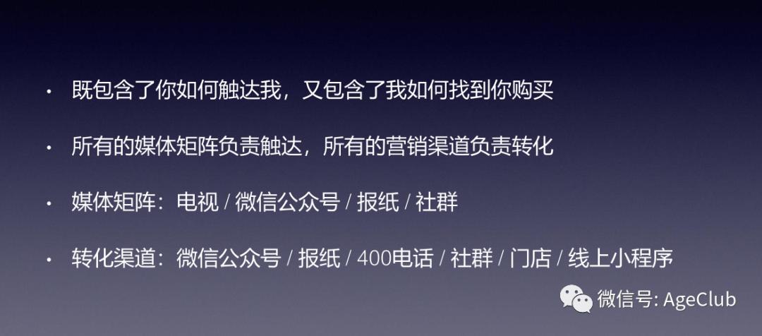 所有媒体矩阵负责触达,所有营销渠道负责转化,各自负责不同分工。