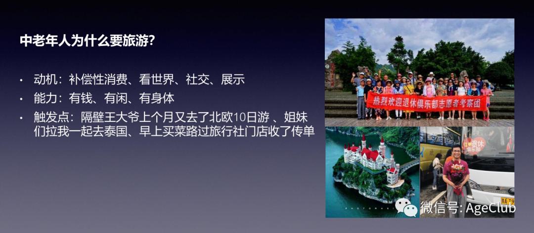 还有一部分中老年,长时间生活在一个有组织有纪律的地方,退休之后会无所事事,需要社交、展示,让别人知道他过得很好。而旅游是一个非常好的展示方式,我们也阴差阳错选择了这个领域。
