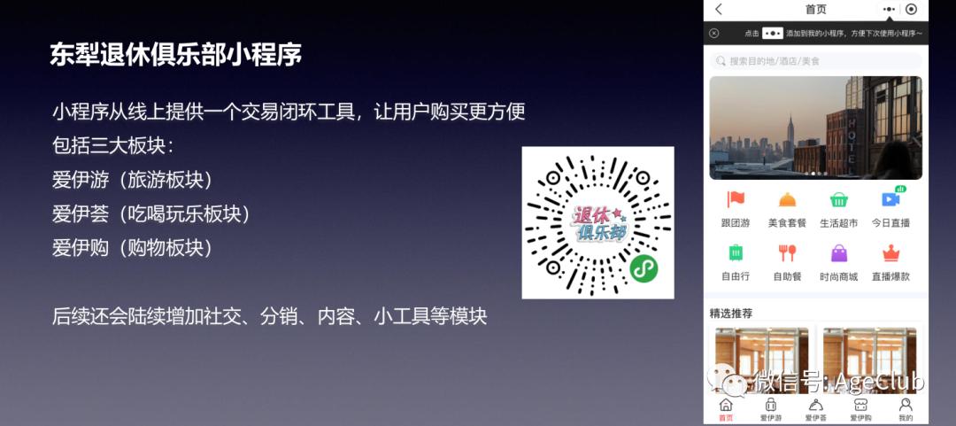 东犁退休俱乐部其实比较简单:第一大版块是拥有自己的媒体矩阵,第二大版块是旅游、电商、教育、健康以及直播五大业务版块。