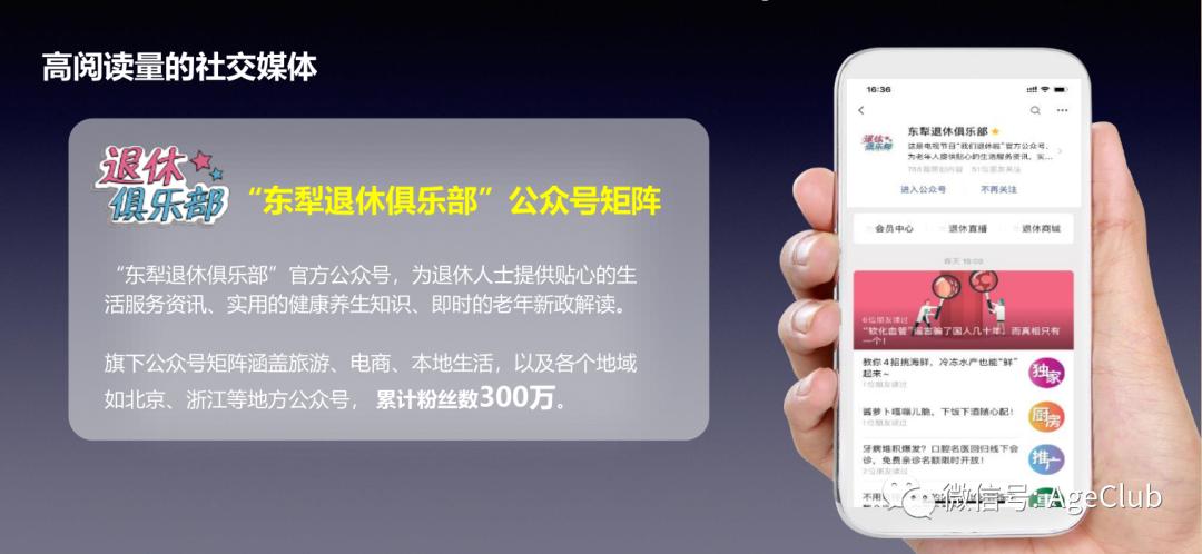 媒体矩阵分别由电视节目、微信公众号、报纸组成,从这三个维度的配置可以明显看到,我们是一个非常传统的针对老年人的媒体模式。