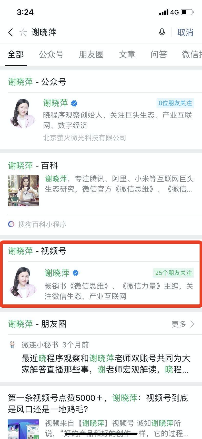 如图所示,搜索关键词,在公众号、百科下方,就是视频号的展示和入口。