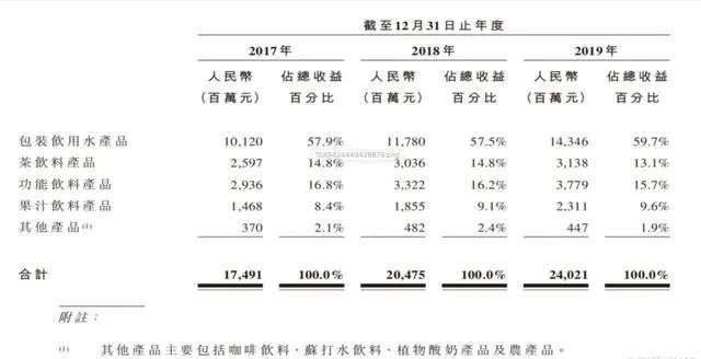 如此“不差钱”,也难怪农夫山泉不愿上市。从农夫山泉的收入构成来看,其过去三个财年的收入中都是饮用水产品占了大头,其中2017年、2018年以及2019年的营收中,饮用水收入占比都超过57%,近一年稍有提升至59.7%达143.5亿元。饮用水收入的年增长率保持在17%左右。