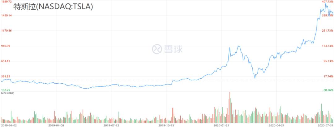 (特斯拉股价走势图,右轴百分数比基数为2019.1.2,数据来源:雪球网)
