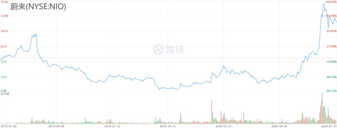 (蔚来股价走势图,右轴百分数比基数为2019.1.2,数据来源:雪球网)