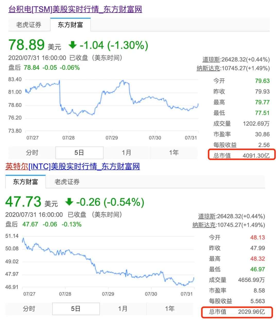 台积电和英特尔市值对比,图源:东方财富网