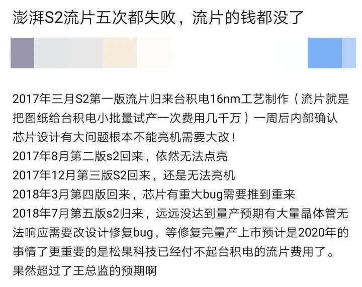 网上关于小米澎湃S2流片失败5次烧掉几十亿的传闻,图源:网络