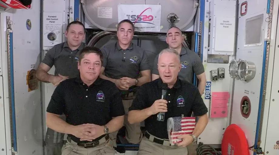 为了纪念美国载人飞船重返美国领土,Behnken 和 Hurley 从国际空间站带回了一面美国国旗,这枚旗帜在国际空间站度过了 9 年时光。2011 年,最后一批航天飞机机组人员离开时留下了它,并要求只有下一批从美国本土升空的宇航员才能取回旗帜。