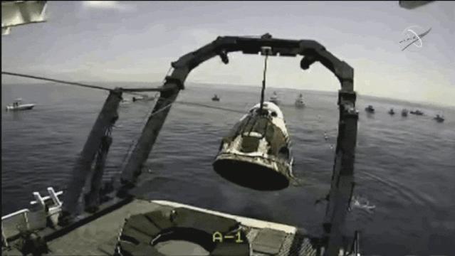 随后,救援船努力将龙飞船从水中拉起。Behnken 和 Hurley 终于可以退出太空舱,再次呼吸到新鲜空气。至此,降落过程最危险的部分完成。
