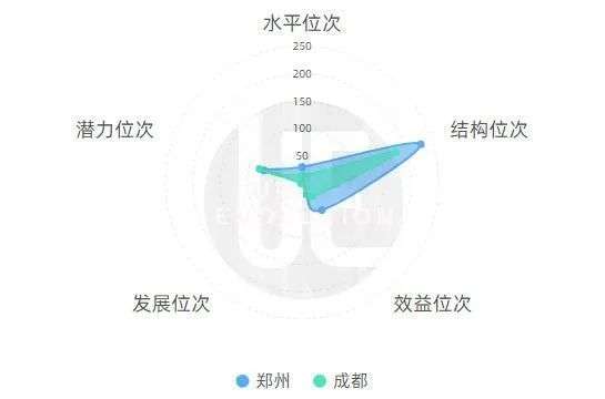 郑州、成都两座城市有着较高的发展位次、但在结构位次上却较为落后,以郑州为例,其发展位次在所有城市中排名第一,但结构位次却仅排在第229位,形状是一个指向结构位次的箭头;