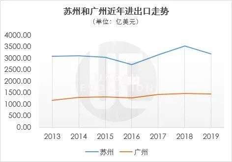 总体上看,两座城市7年间进出口总额都实现小幅上升。与广州较平缓的发展步调相比,苏州波动较为明显,特别是在2015年与2018年两年,出现明显下降。