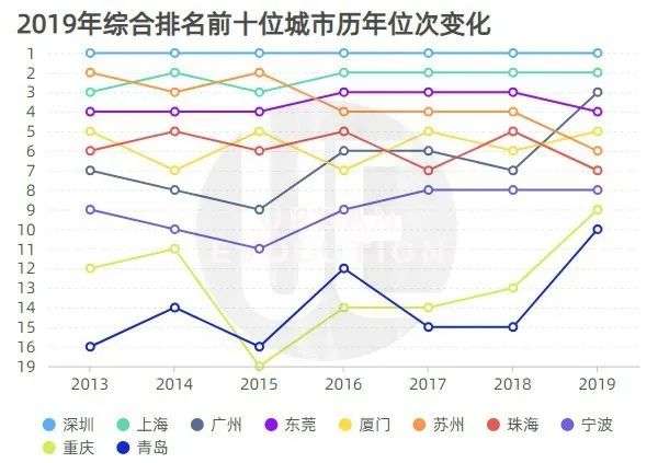 聚焦2019年综合排名前十位城市,变化最明显的当属广州、苏州与重庆三座城市。其中,与2013年相比,广州与苏州几乎“对调”——广州从第七名上升4位至第三名,而苏州则从第二名下降4位至第六名。