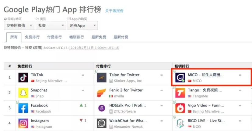 MICO 在沙特阿拉伯登社交类畅销排行榜榜首