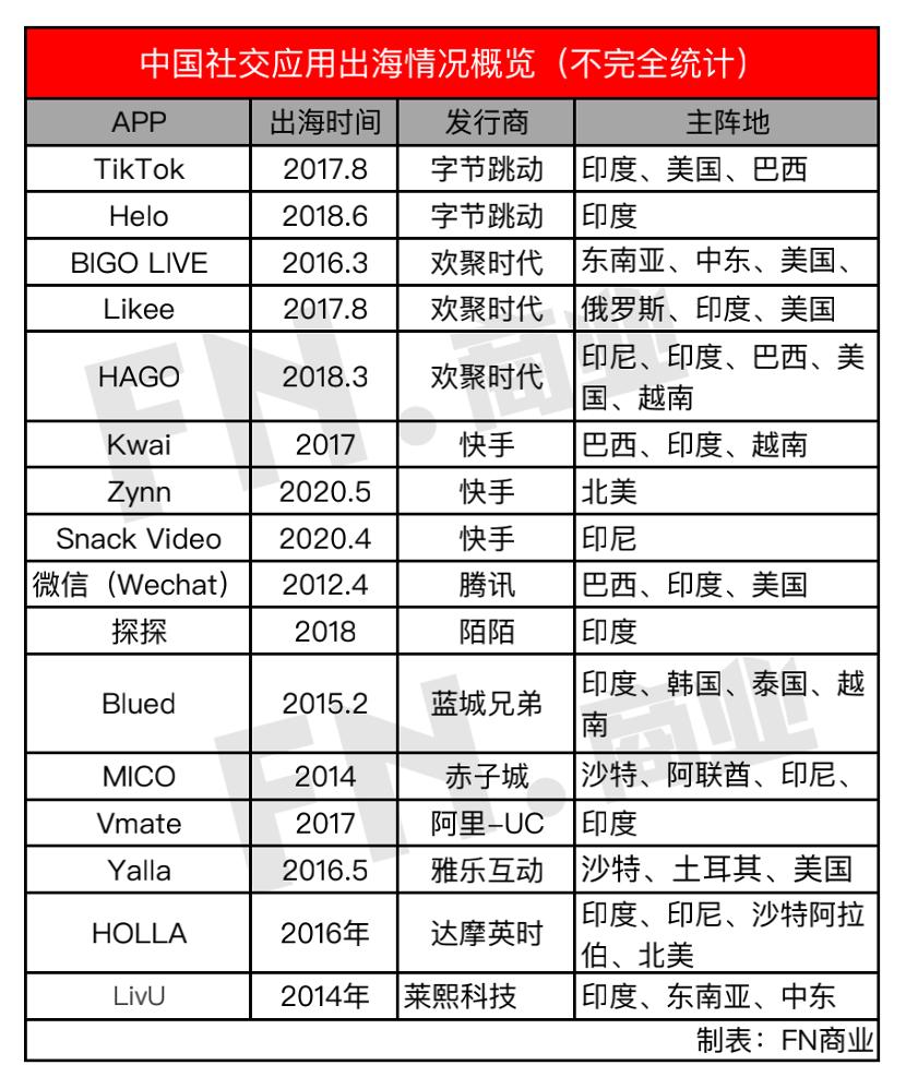 在被美国、日本、印度、澳大利亚等联合打压之前,这一路线的成功代表无疑是TikTok,此外还有陌陌旗下的探探,欢聚时代旗下的BIGO LIVE、Likee等;失败的典型案例则是作为微信海外版的Wechat;一直在挣扎、试图自救的是快手阵营,率先出海的快手国际版Kwai没有掀起大的水花,一度被叫停,策略重启后,搭配矩阵软件Zynn、Snack Video等,在未来或还有一拼之力,但当下存在感还不够强。