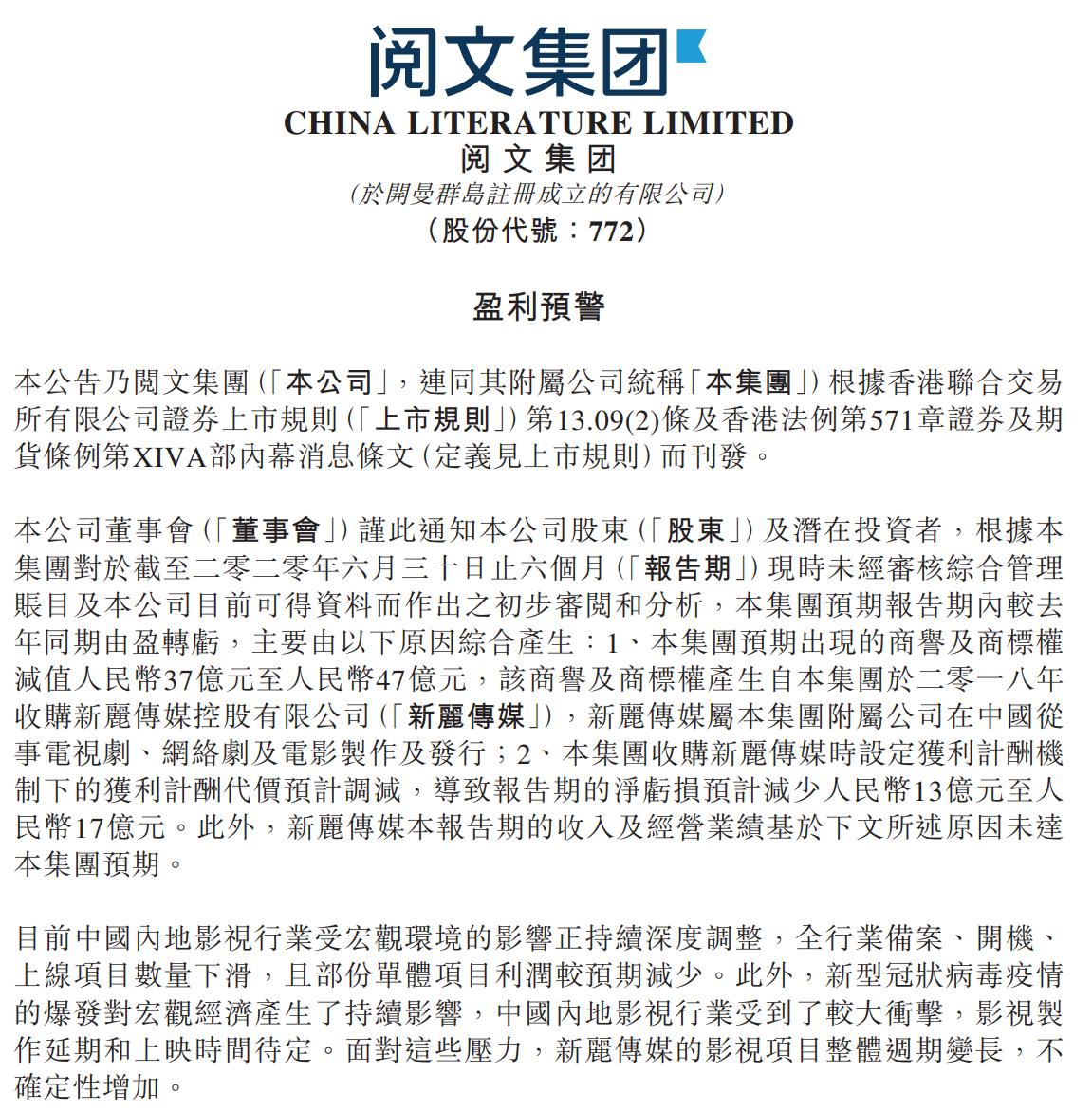 7月20日晚,阅文集团发布盈利预警,预计公司截至2020年6月30日的6个月业绩,将较去年同期由盈转亏。综合商誉减值和计酬调减,阅文集团今年上半年预计将亏损20亿至34亿元(人民币,下同),而去年同期为盈利3.9亿元。