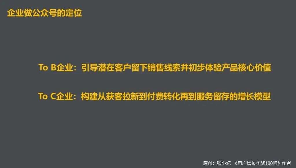 to C企业做公众号,可以依托于公众号、小程序、社群,建立起一套完整的用户增长模型,从拉新到付费再到服务留存,但根据不同的业务形态及发展阶段,可以有侧重点。