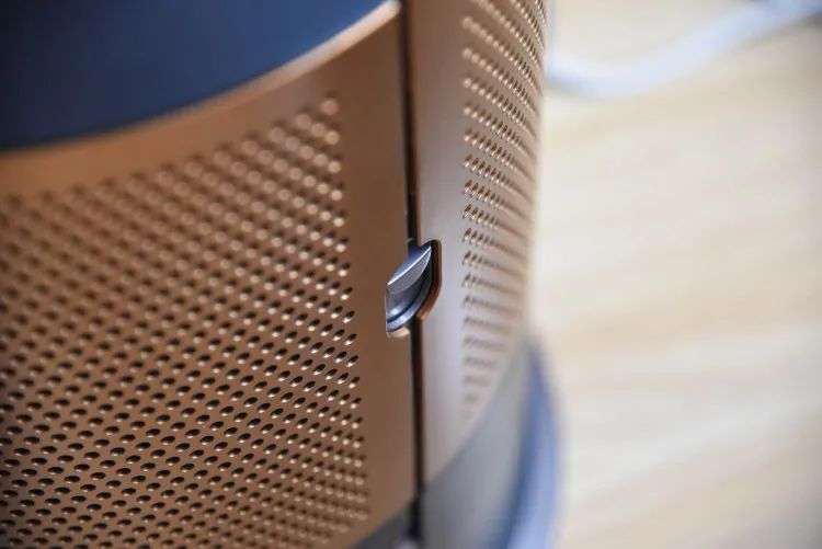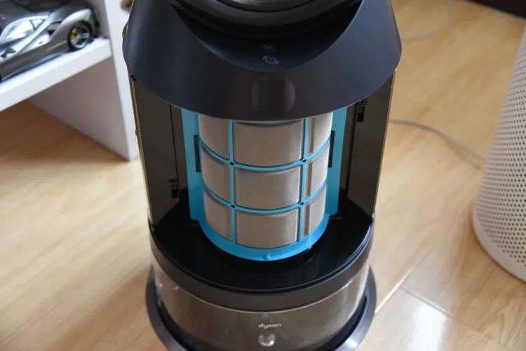 拆开戴森风扇内部系统,我们可以看到最内侧有一个黄色圆柱体。在没看说明书之前,我一度以为这也是一层空气净化滤网,但事实并非如此,它是净水滤网,官方称之为抑菌银丝蒸发网。