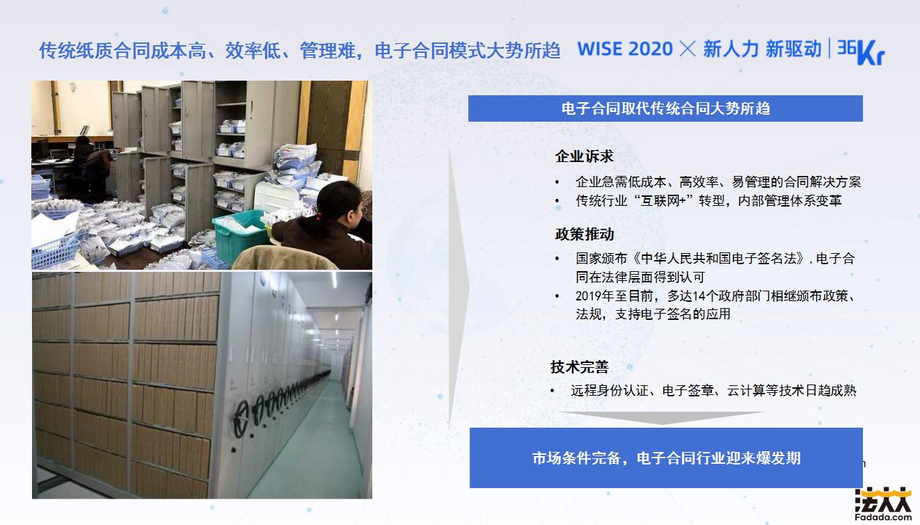 传统纸质合同有很多的弊端,大家有深切的感受。比如说他的使用成本是比较高的,而且签的慢。在转化成电子化以后,降本增效是很明显的感受,尤其是在大型企业,使用量越大,痛点越明显,收益越高。在政策推动方面,其实一方面有电子签名法,另外一方面其实2019年到现在有很多国家的部委在对电子签名的使用和推广出具相应的文件和相关的国家政策方面的推动。从电子签名的应用来看,身份确认,远程认证的技术,云的技术,安全技术的发展也让电子签名的推广非常顺理成章,在各行业的应用越来越广泛。