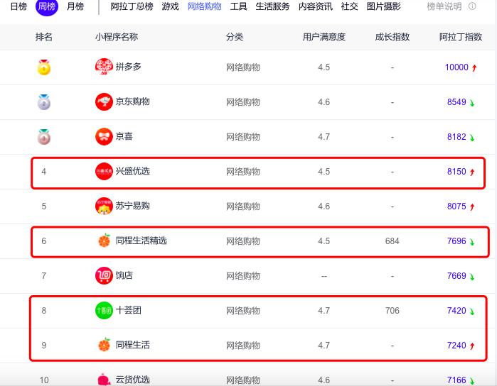 巨头争相抢滩布局社区团购业务,大有将这一赛道推至“风口”之势。8月4日的阿拉丁榜单显示,在最近一周的网络购物小程序动态排名中,前十位就有四席被社区团购小程序占据。其中兴盛优选排在第四位,仅次于拼多多、京东和京喜;同程生活精选和同程生活分别排在第六位及第九位,十荟团则排在第八位。