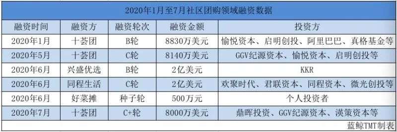2020年6月,兴盛优选及同程生活也接连宣布完成融资,其中,兴盛优选获得由美国KKR投资的2亿美元B轮融资,同程生活则获得由欢聚时代领投的2亿美元C轮融资。同月,社区生鲜摊项目“好菜摊”也完成500万元种子轮融资,投资方为个人投资者。