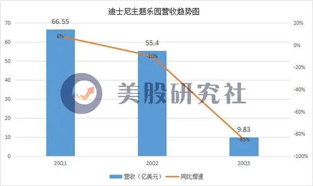 迪士尼旗下主题公园、体验和产品业务第三季度营收为9.83亿美元,与去年同期的65.75亿美元相比下降85%;该部门的运营亏损为19.60亿美元,相比之下去年同期的运营利润为17.19亿美元。