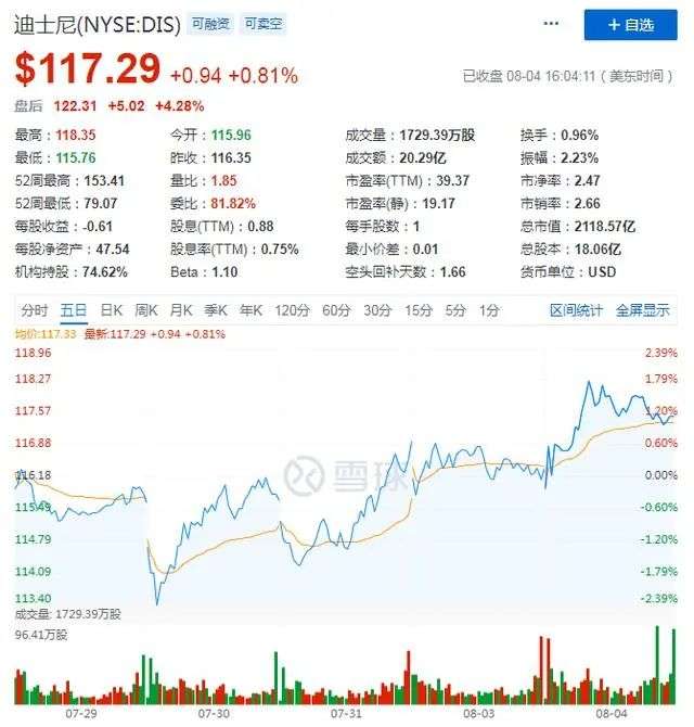 因出人意料地实现盈利,财报公布后,迪士尼周二盘后股价先跌后涨,涨幅超4%。截至目前,迪士尼盘后股价为122.31美元,盘后上涨4.28%,市值为2118.57亿美元。