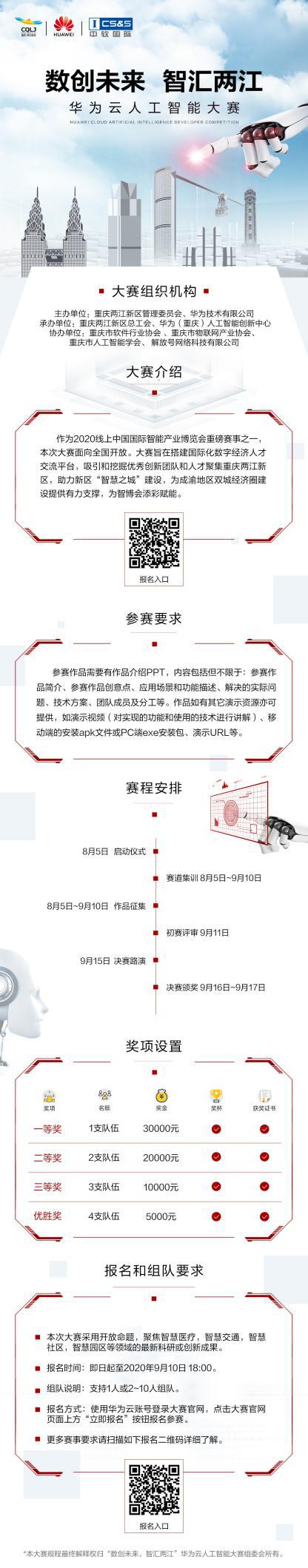 8月5日,2020线上智博会重要赛事之一——“数创未来,智汇两江”华为云人工智能大赛(以下简称“大赛”)启动报名,全国各地从事人工智能产业相关技术方向的企业、高等院校、科研单位、创业团队、个人等均可组团报名参赛,报名截止日期9月10日18:00。