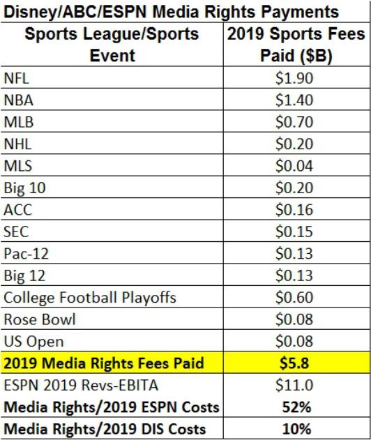 ESPN为购买美国体育转播版权支付了最高的费用,已经成为美国主要体育联盟重要的媒体合作伙伴。2019年,Disney为美国广播公司和ESPN等投资了约58亿美元,从而获得了十分稀有的全美国体育直播内容的媒体转播权。这项体费用占到ESPN年度总支出的52%,以及Disney总费用的10%。这类体育转播内容,一般都会签署长期合同,合同期可能长达10年,并且通常情况是是具有排他性的。