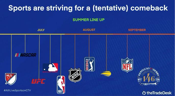 图注:疫情期间,美国各大体育直播比赛的预计恢复时间表(来源:the Trade Desk)